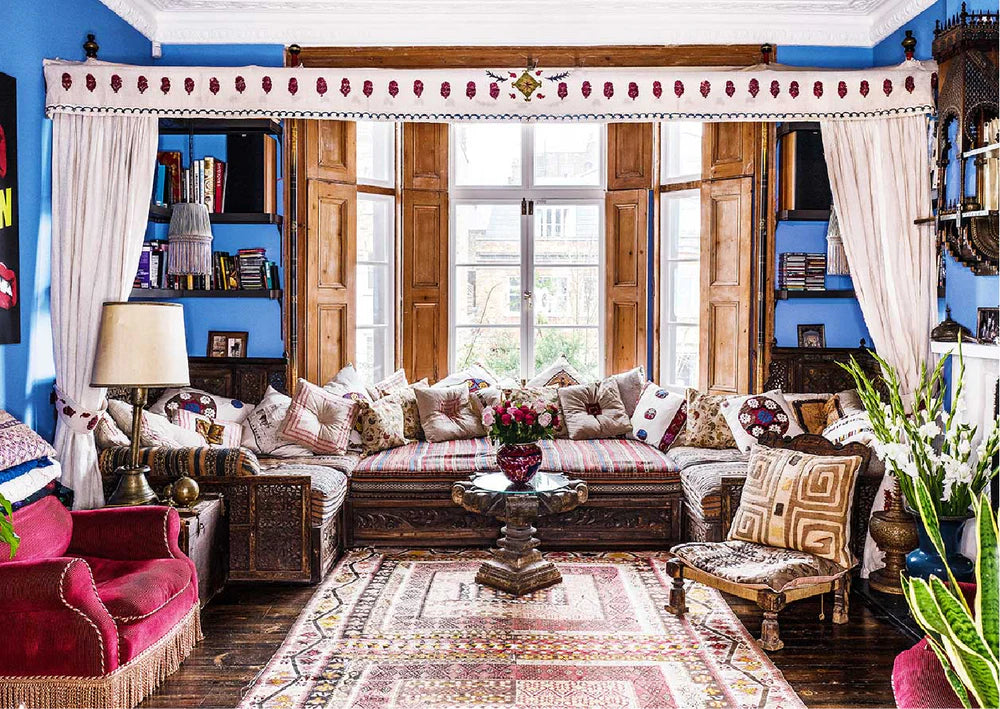 This Edwardian family home incorporates an unexpected but harmonious mix of materials, decorations and shapes into its design. Wood panelling with a linear diamond shaped motif reminiscent of those produced by the Viennese Secessionist workshop, Wiener Werkstätte adorn the walls of the fumoir – furnished with sumptuous velvet drapes; Jean-Michel Frank chairs; a modernist tripod ashtray and 1960s Gudrun Baudisch vase. The Wiener Werkstätte references continue into the kitchen, with its Josef Hoffmann Thonet dining chairs; Koloman Moser chandelier; bespoke iron and brass work inspired by Gustav Klimt; Paris Metro tiles and reclaimed wood floor stained with a graphic pattern. 1960s Pierre Cardin wallpaper, hand painted Turkish tiles, moorish wooden panels and a Victorian bathtub are contrasted with traditional Chadder & Co fixtures in the bathroom. A Moroccan-style tent by the artist Olivier Mourão is installed in the living room, which is furnished with pillows cut from Peruvian carpets; curtains and a mandala made from antique Suzani textiles; a giant disco ball, and an eclectic art collection.