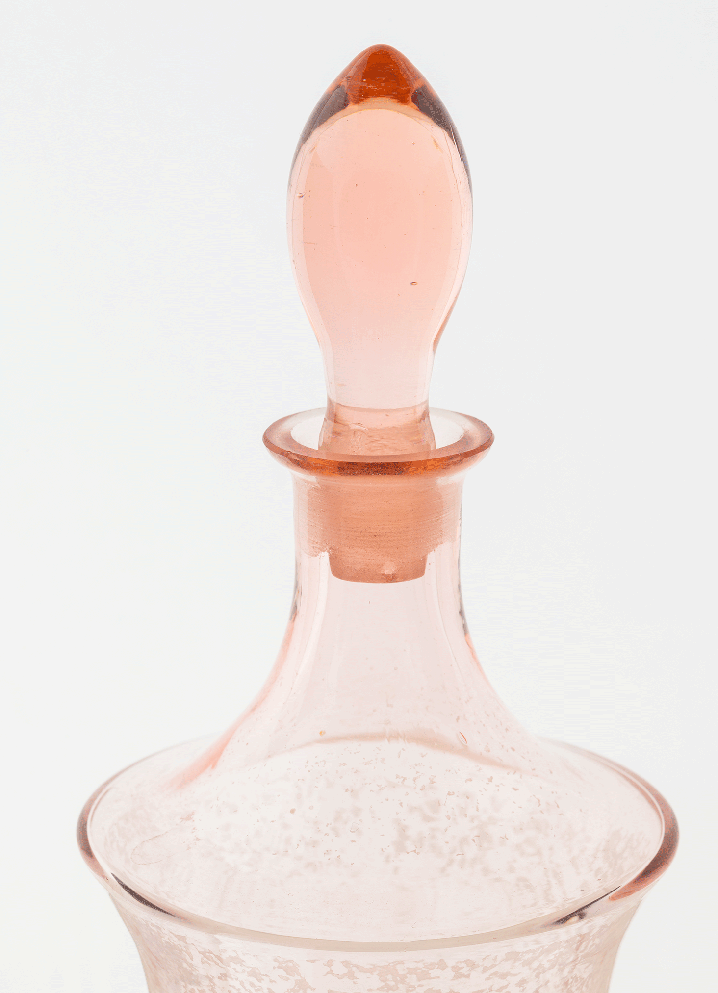 A 1930s vintage decanter set with five matching glasses and mirror tray. The smoked rose colouration of the glass offers a striking and decorative effect. The eye catching round mirrored tray makes an opulent addition to your home bar. This sophisticated art deco decanter set is in good vintage condition and makes it a perfect serving situation for the afterhours.