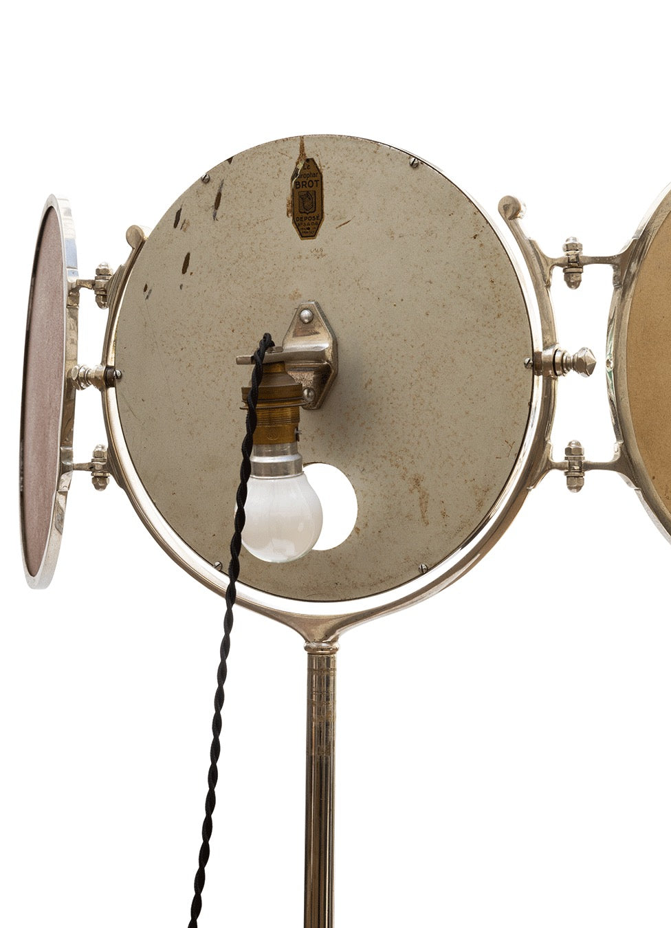 A rare Art Deco French floor mirror with lighting in excellent condition. This piece was designed by Brot in the 1930s. Brot was founded in 1826 by François Brot, mirror designer to King Charles X. An opulent piece that can be used as a shaving or cosmetic mirror. The exquisite design adds a touch of elegance to a bathroom.