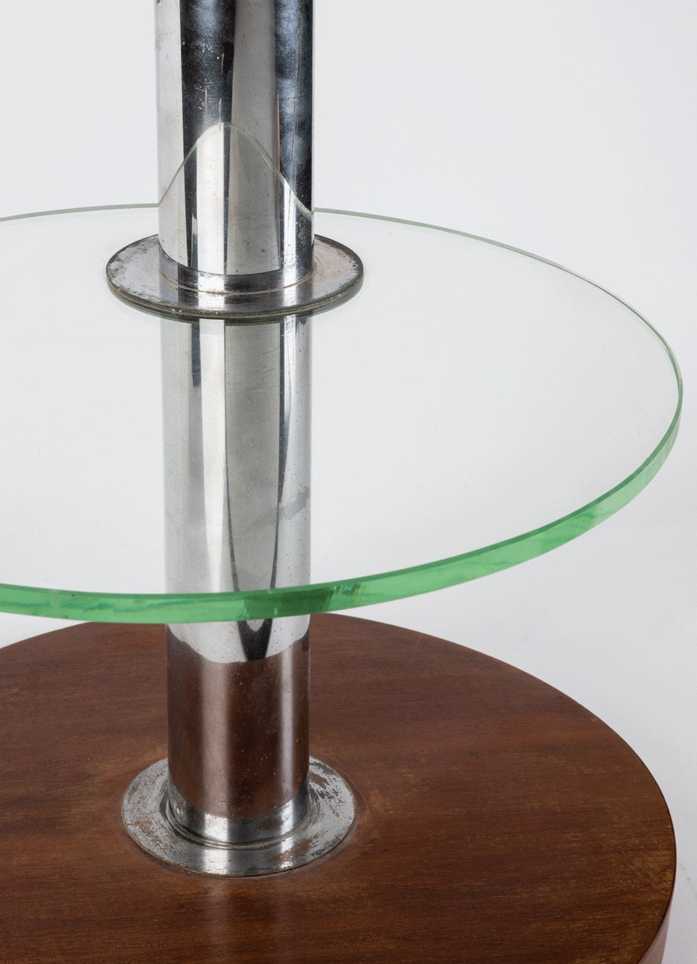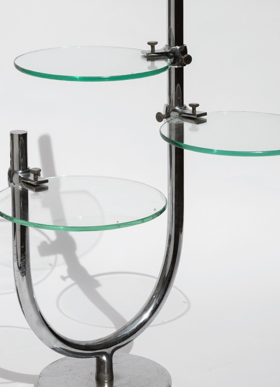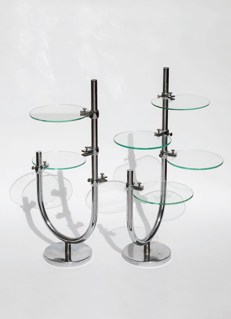 A set of two vintage Art Deco shelves or flower stands in excellent condition. Made of curved chrome plated brass with adjustable mounts and 5 glass plates. A great way to display decorative items or flowers in a space.