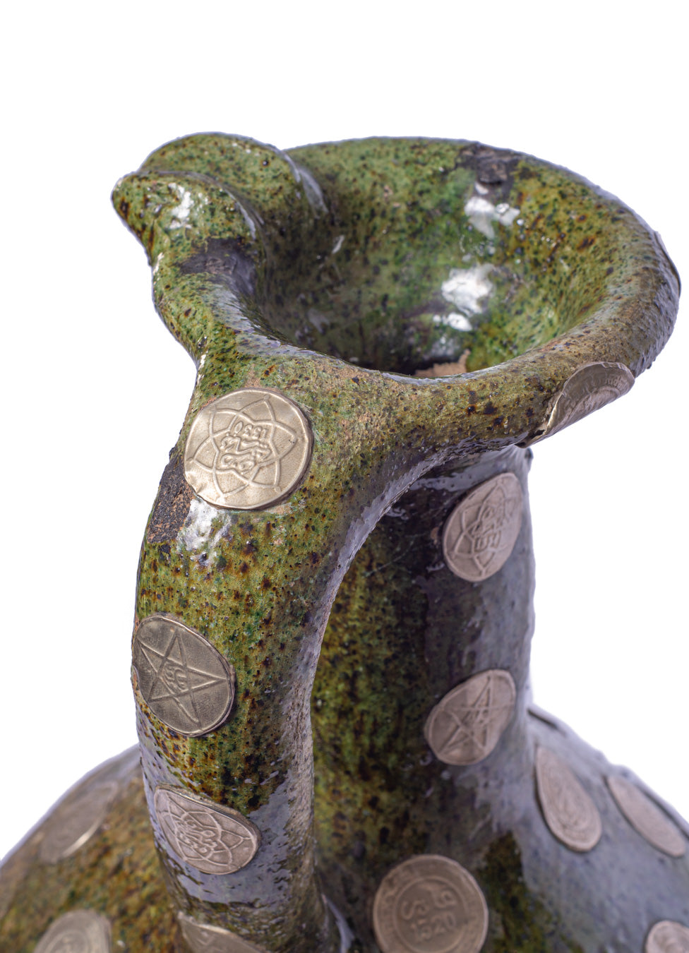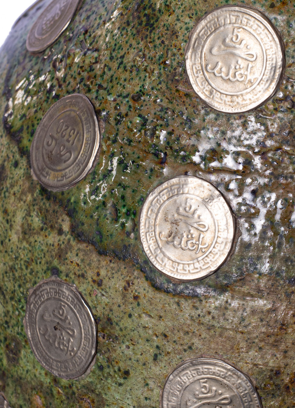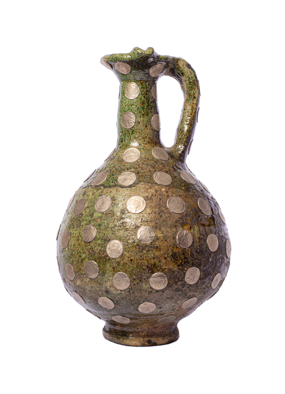 An exquisite embellished hand-crafted jug. Traditional ceramic adorned with an array of metallic vintage coins. The enamel is rich in history, each coin is engraved with numerals, calligraphy and symbols. The deep organic green colouration combines beautifully with the metallic reflections. With a floral arrangement or on its own, this vase makes a striking impression. A collector’s piece and one-of-a-kind treasure.