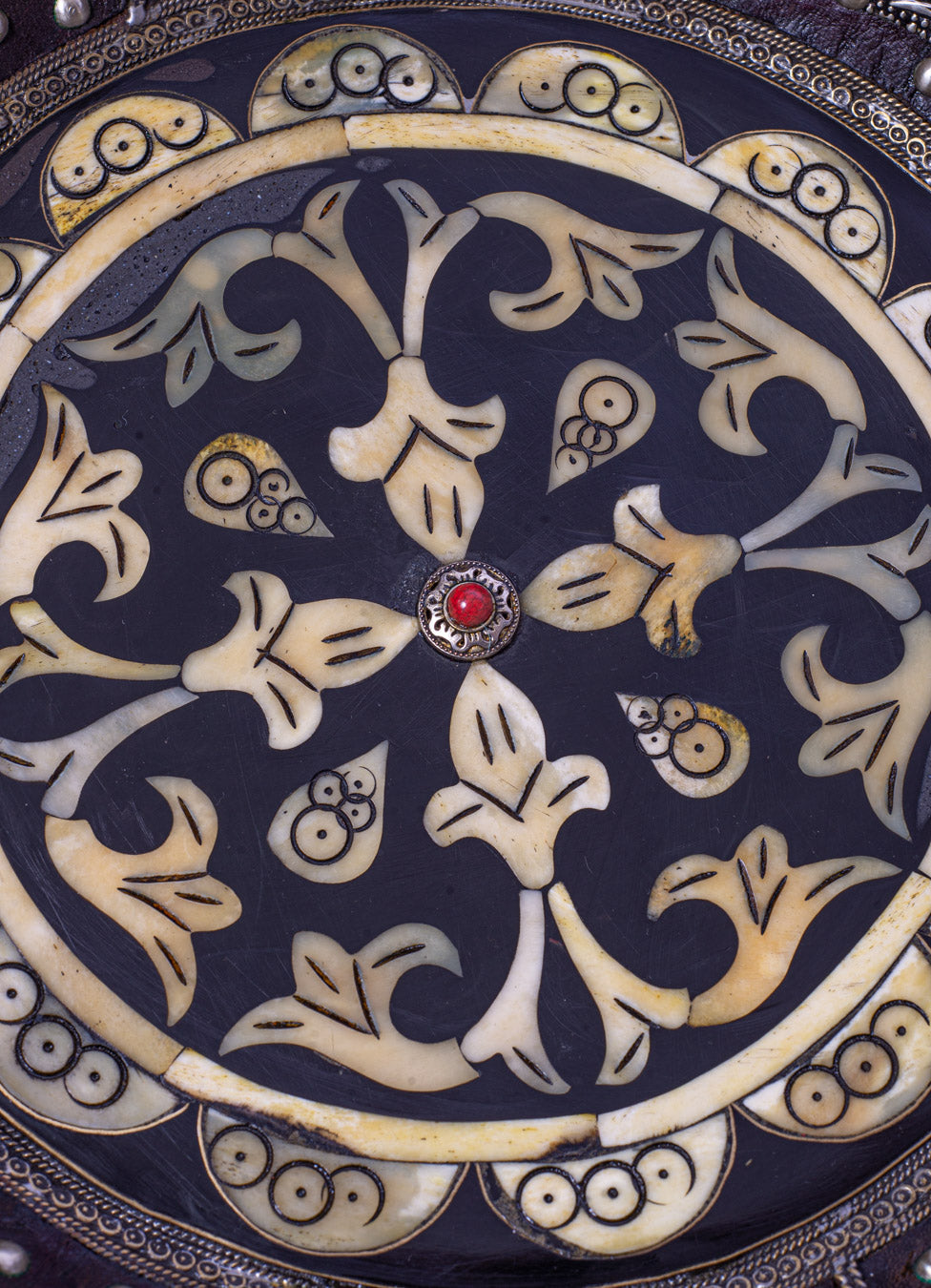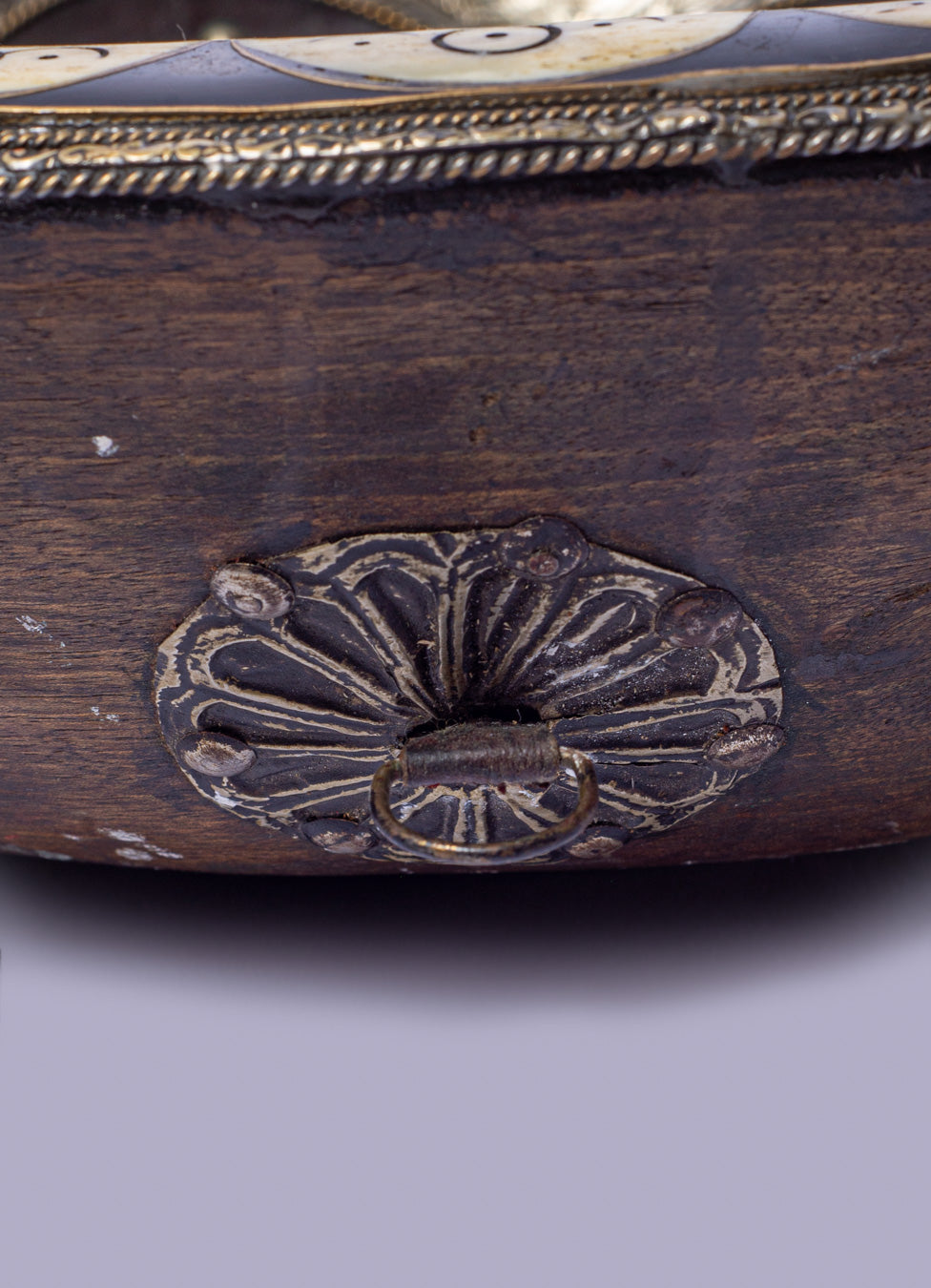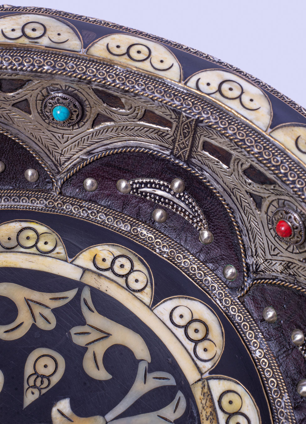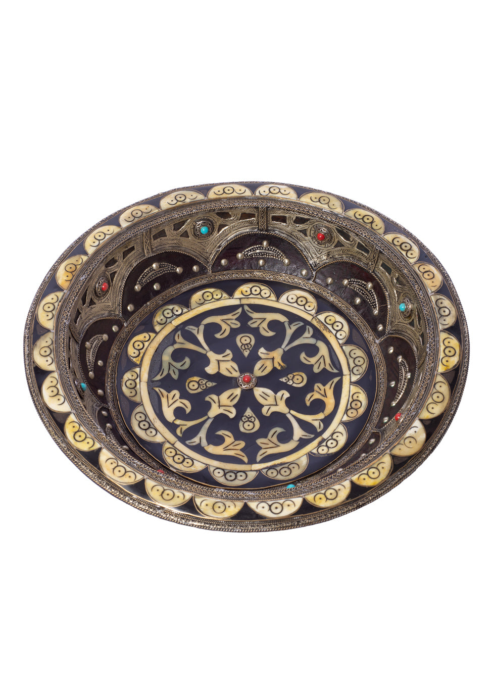 This vintage Moroccan bowl is a unique way to present and serve fruit. The bowl is crafted from a stunning combination of materials. It is adorned with recycled nickel silver filigree. White repurposed camel bone was meticulously cut by hand and embedded on a wooden surface. It is encrusted with an array of red, turquoise stones and metal studs that add a subtle sparkle. Guests will be dazzled by the intricate detailing. This piece is in excellent vintage condition.