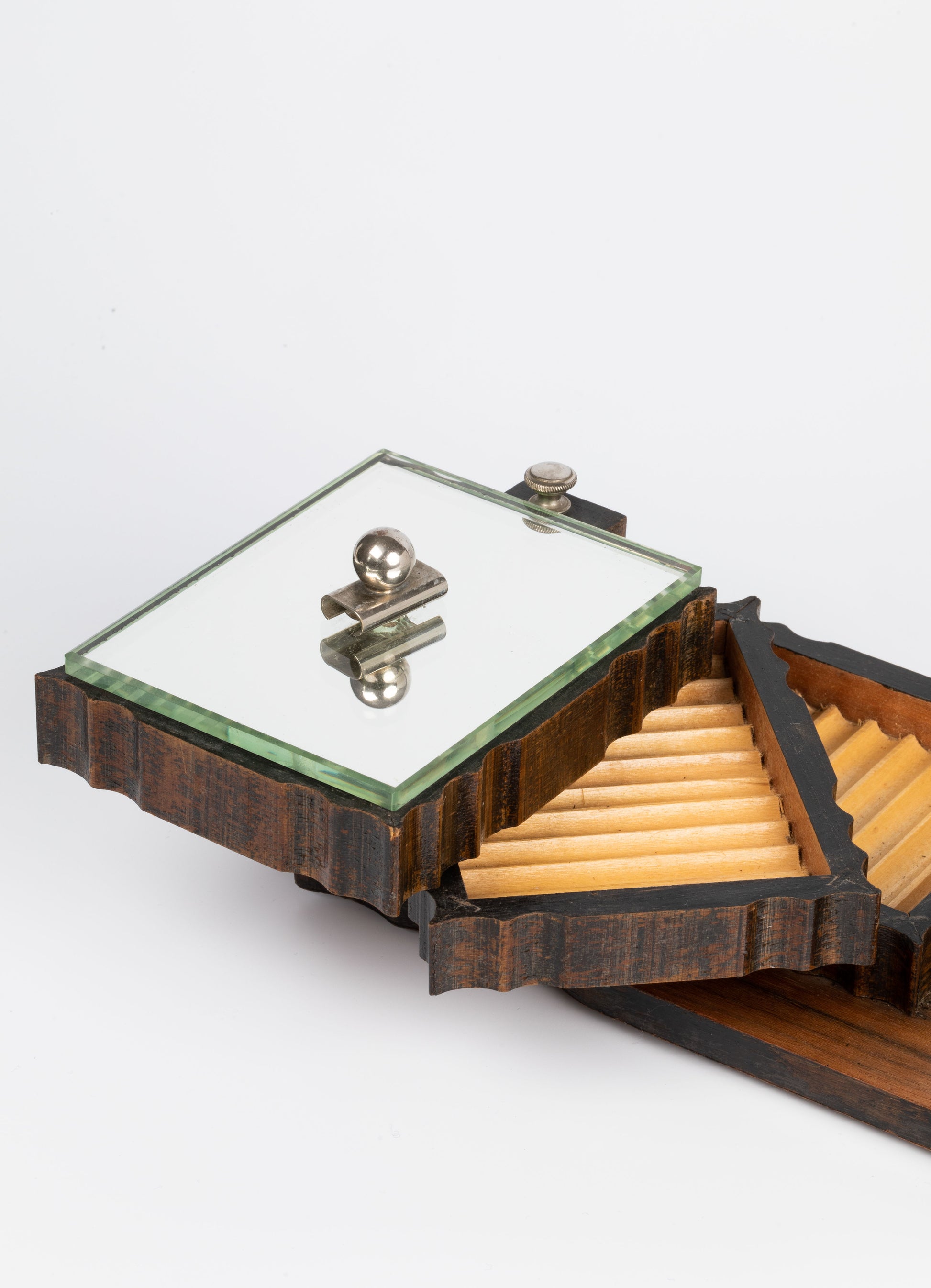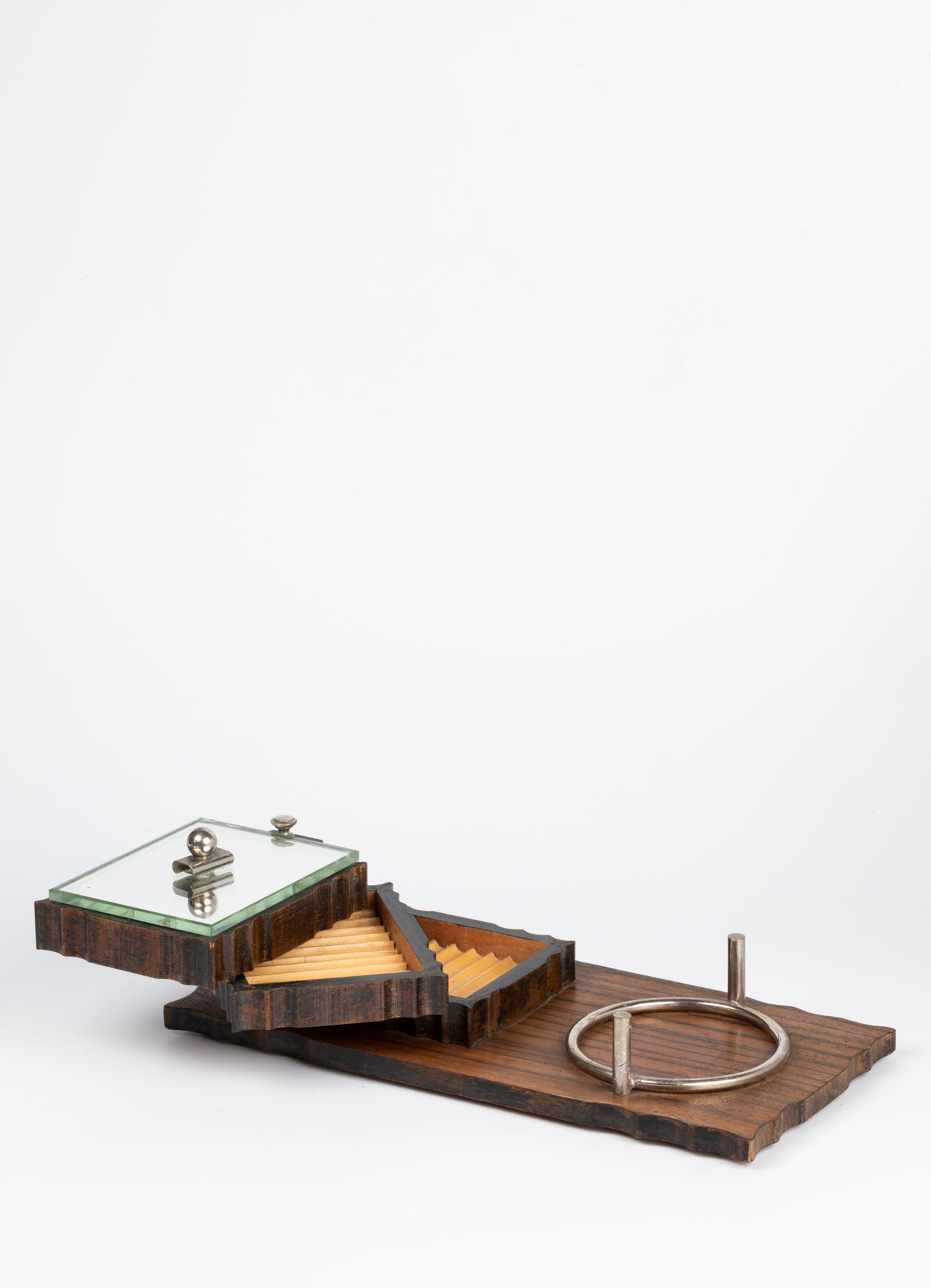 A unique vintage smoking set in excellent condition. It is the perfect home accessory for entertaining. It features a removable crystal ash tray and a cigarette holder made from dark rich palmwood with a mirrored lid. Guests will adore the elegance of this ashtray. A stylish and timeless piece that is suitable for a fumoir or to complete your bar.