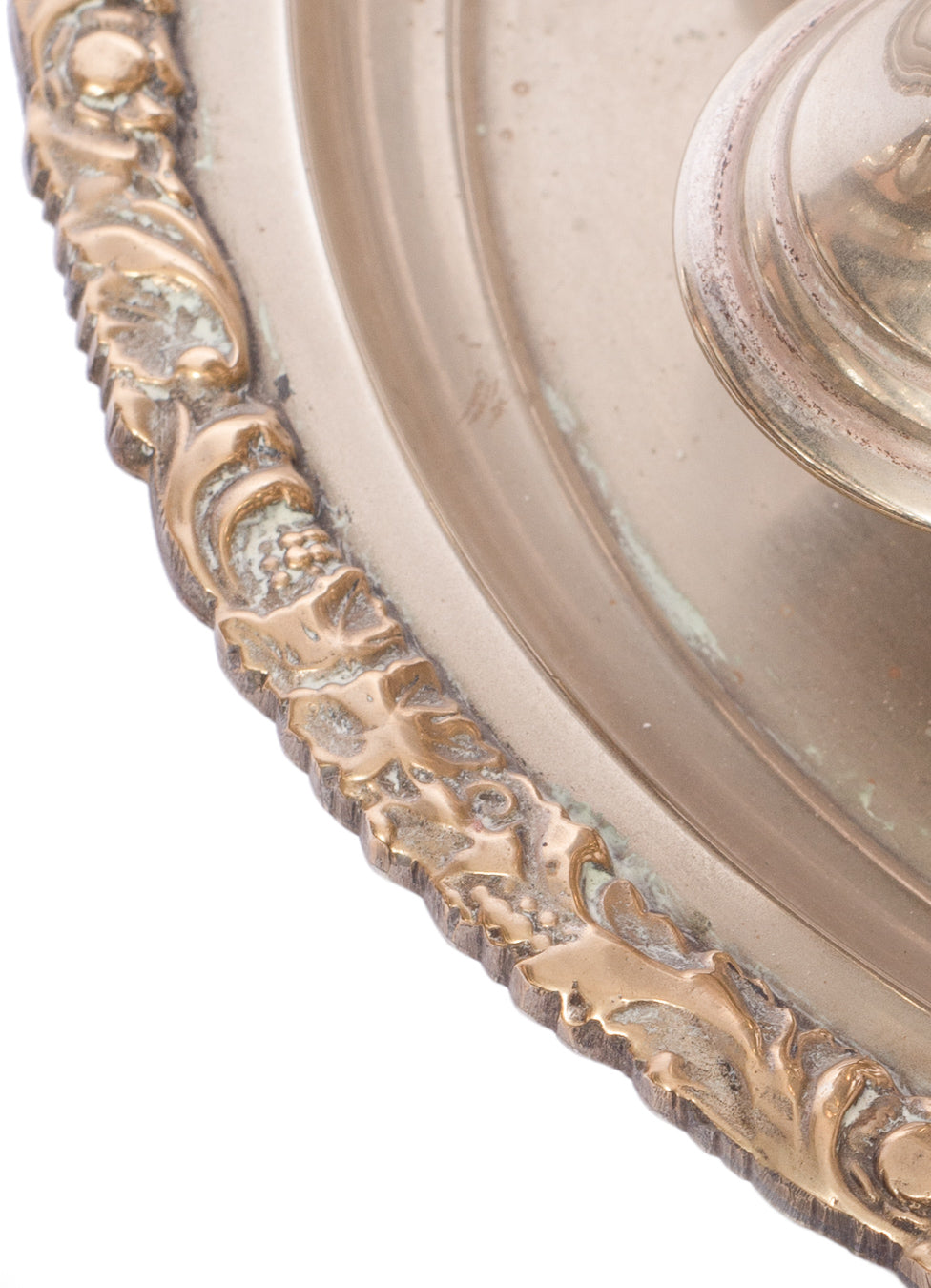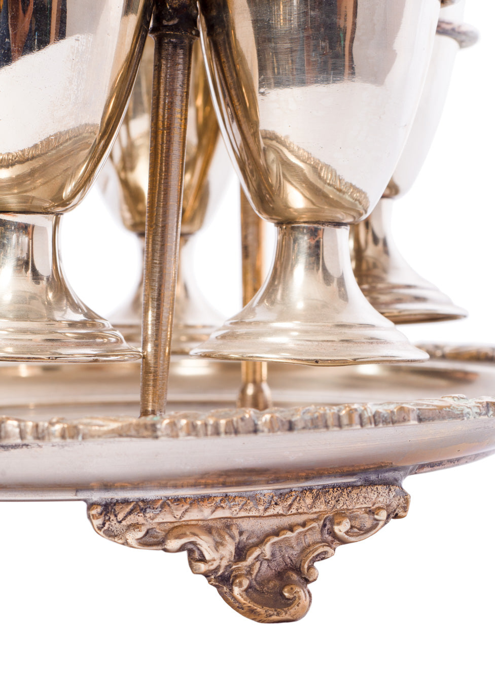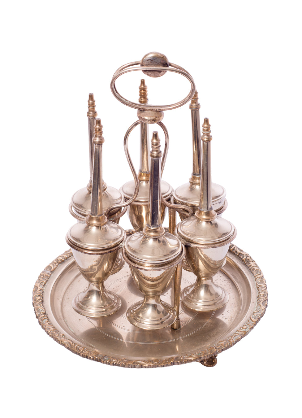 A unique set of x 6 vintage traditional silver-plated Moroccan perfumers with an elegant tray. In Morocco, rose and orange blossom water are traditionally kept in perfumers. The elaborate tops can be unscrewed and filled with various fragrances. The tray features an intricate filigree pattern around the rim. Bring an exotic touch to your dressing table or bathroom.